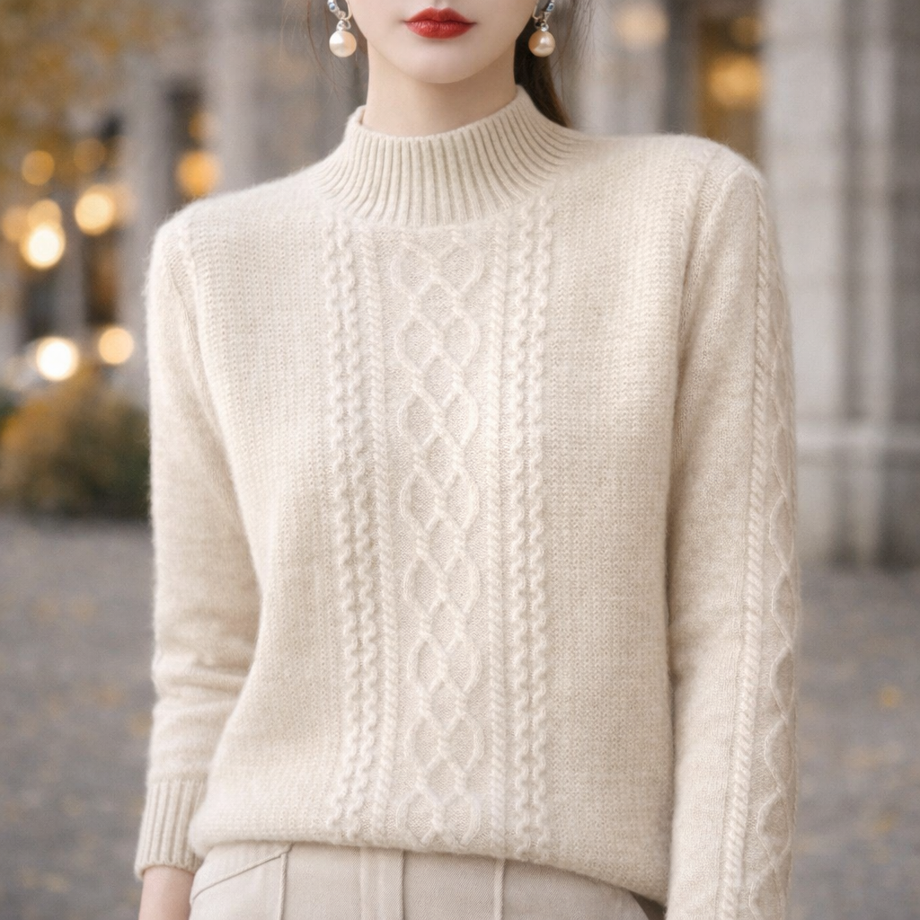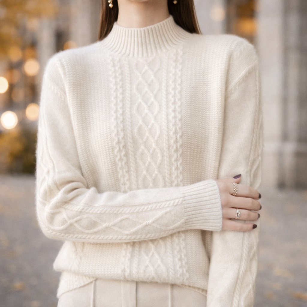 Soft blush wool blend with intricate cable details and a gentle high neck. Designed with long ribbed cuffs for warmth and a feminine shape that flatters in every light.