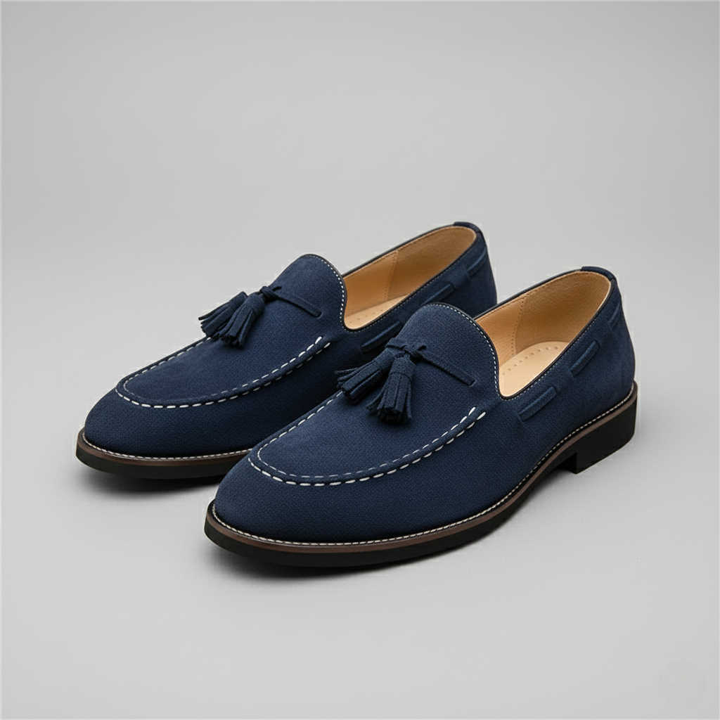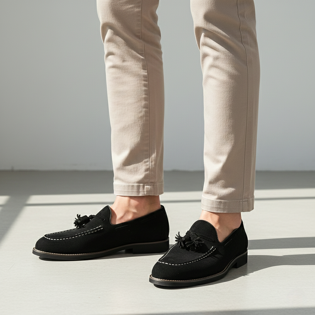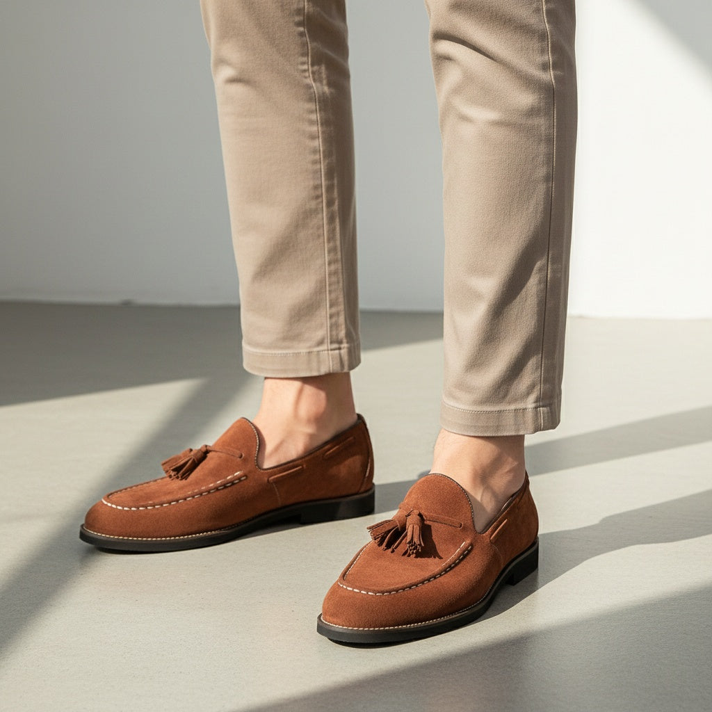 Crafted from soft suede with a refined, matte finish, these tassel loafers offer a balanced structure and natural flexibility. A supportive sole and slip-on construction ensure comfort throughout the day. Designed for polished everyday wear in the city or at work.
