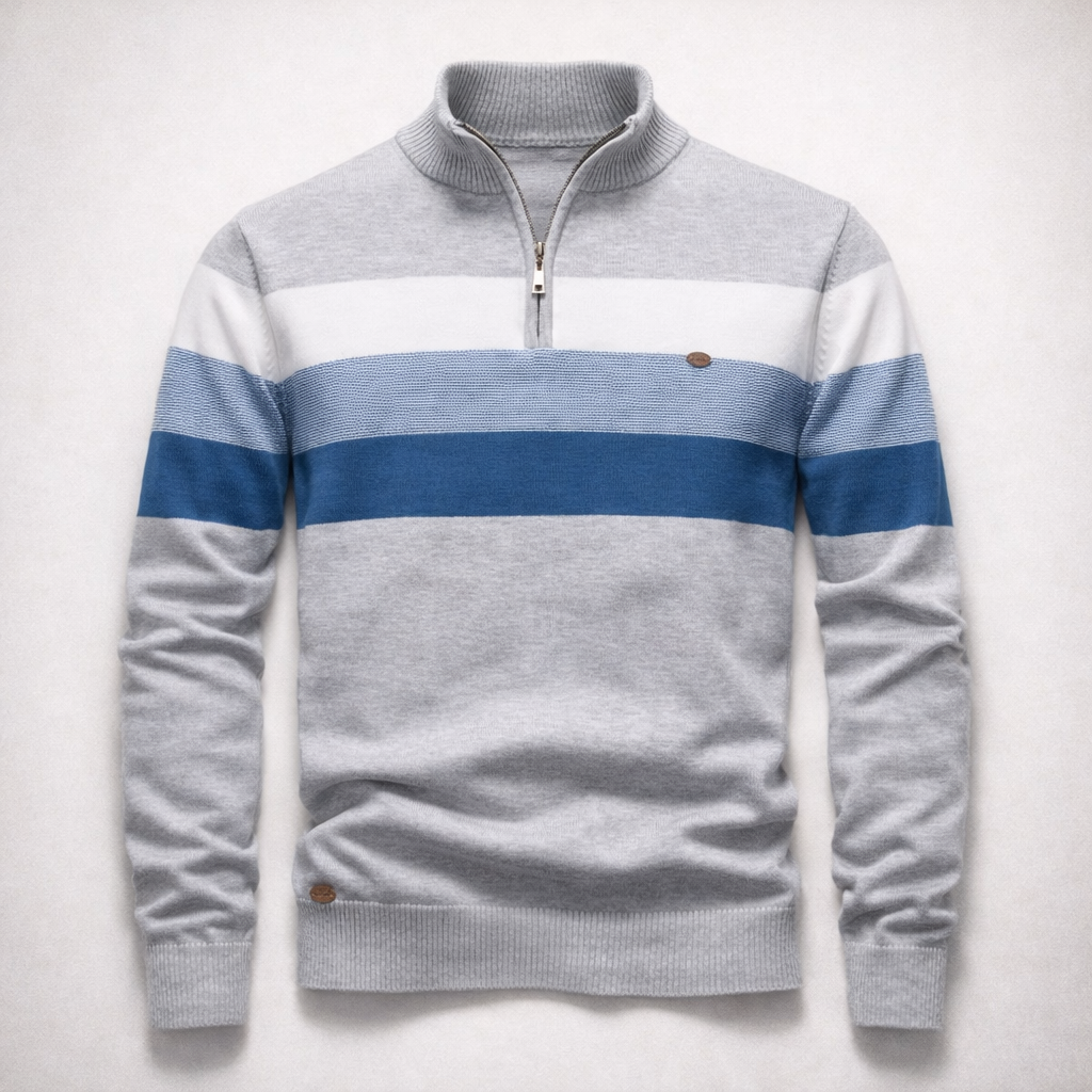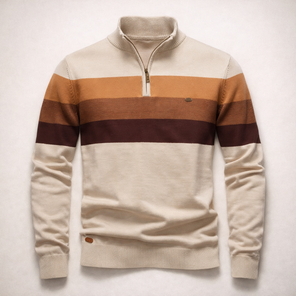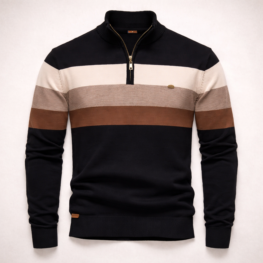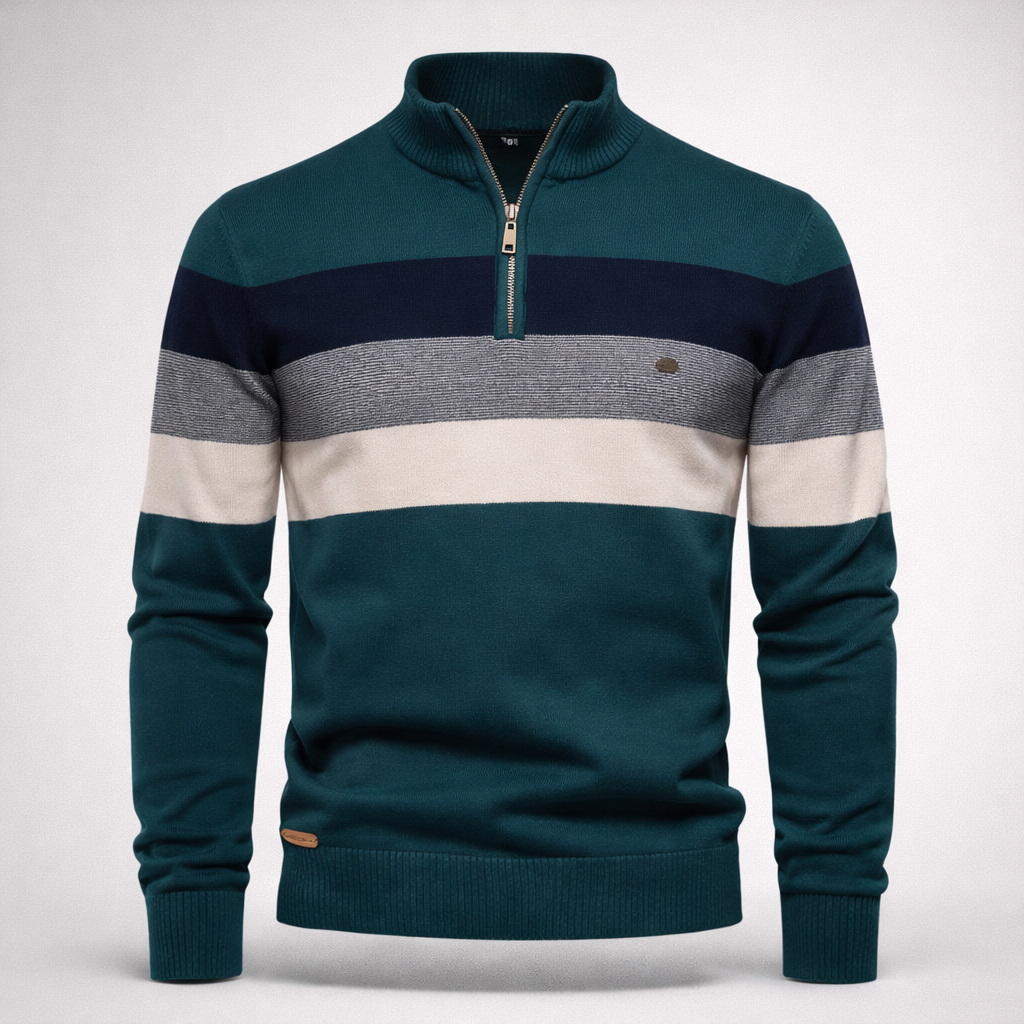 Bold horizontal stripes and a structured half-zip collar give Lorenzo a refined yet relaxed appeal. The soft cotton knit ensures comfort, while ribbed cuffs and hem add a clean finish