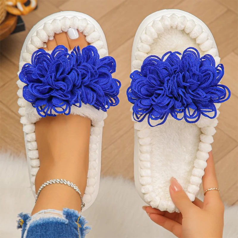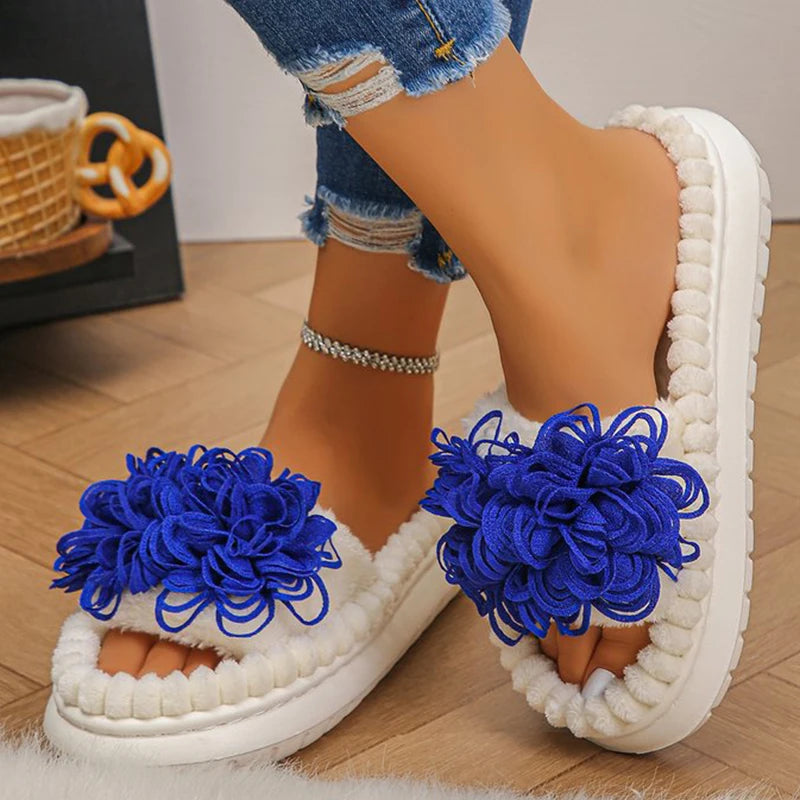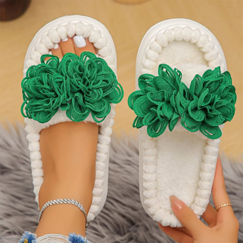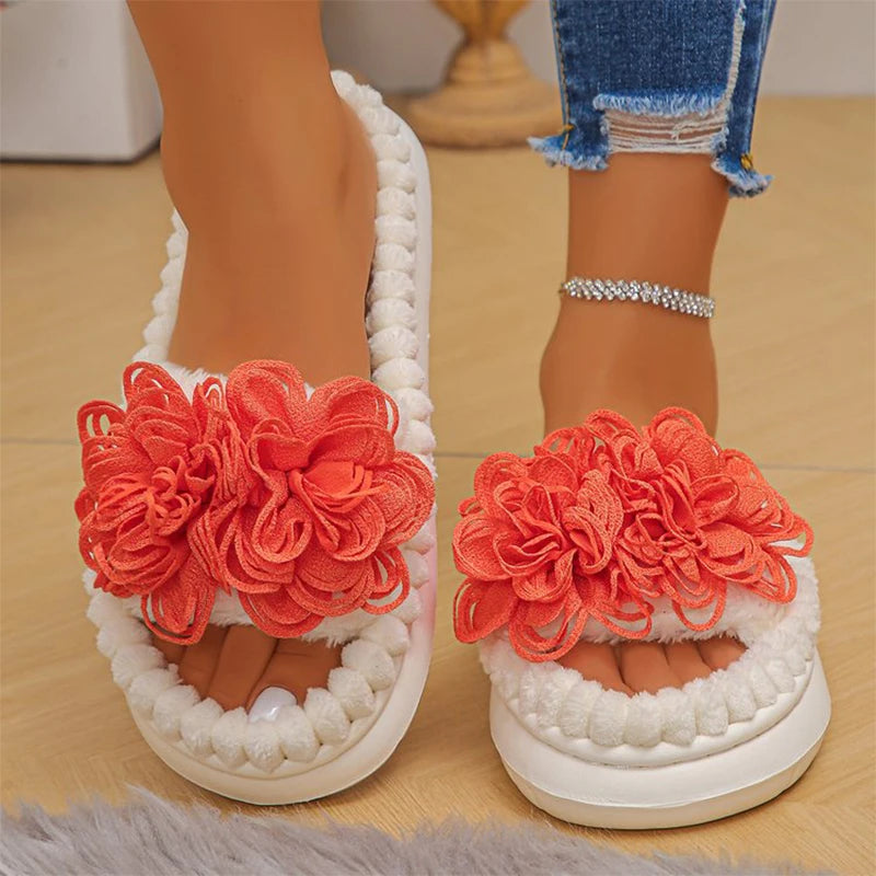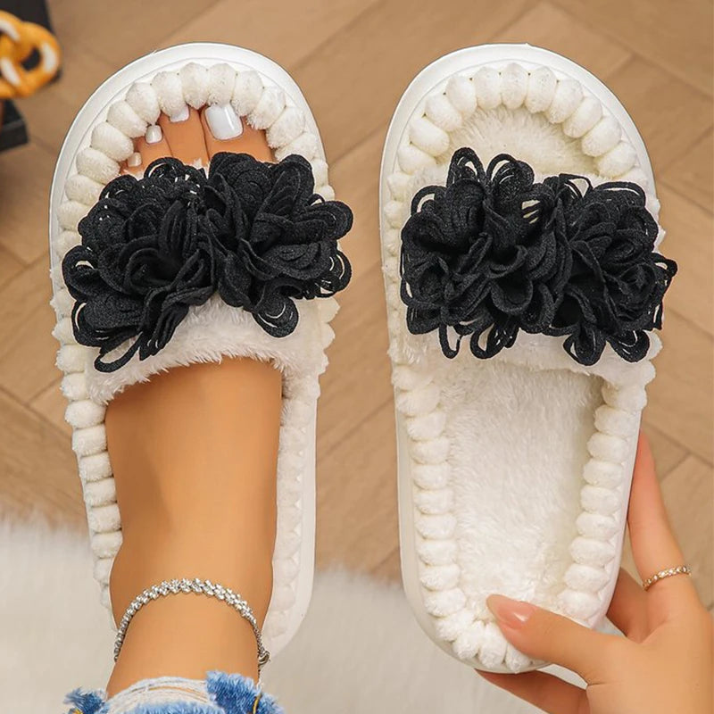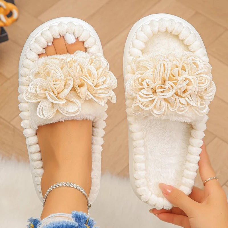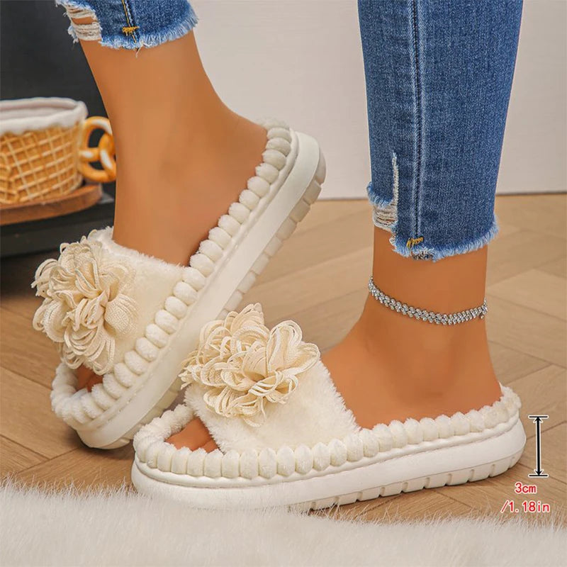 Soft, open-toe house slides finished with a sculpted floral detail and a plush lining. The thick cushioned sole gives a stable, elevated feel, designed for refined comfort at home with a decorative, feminine touch.